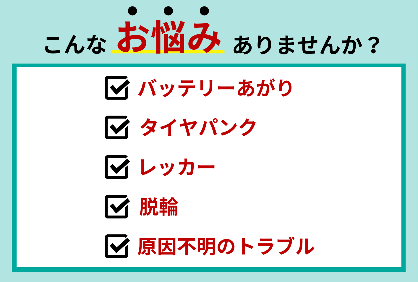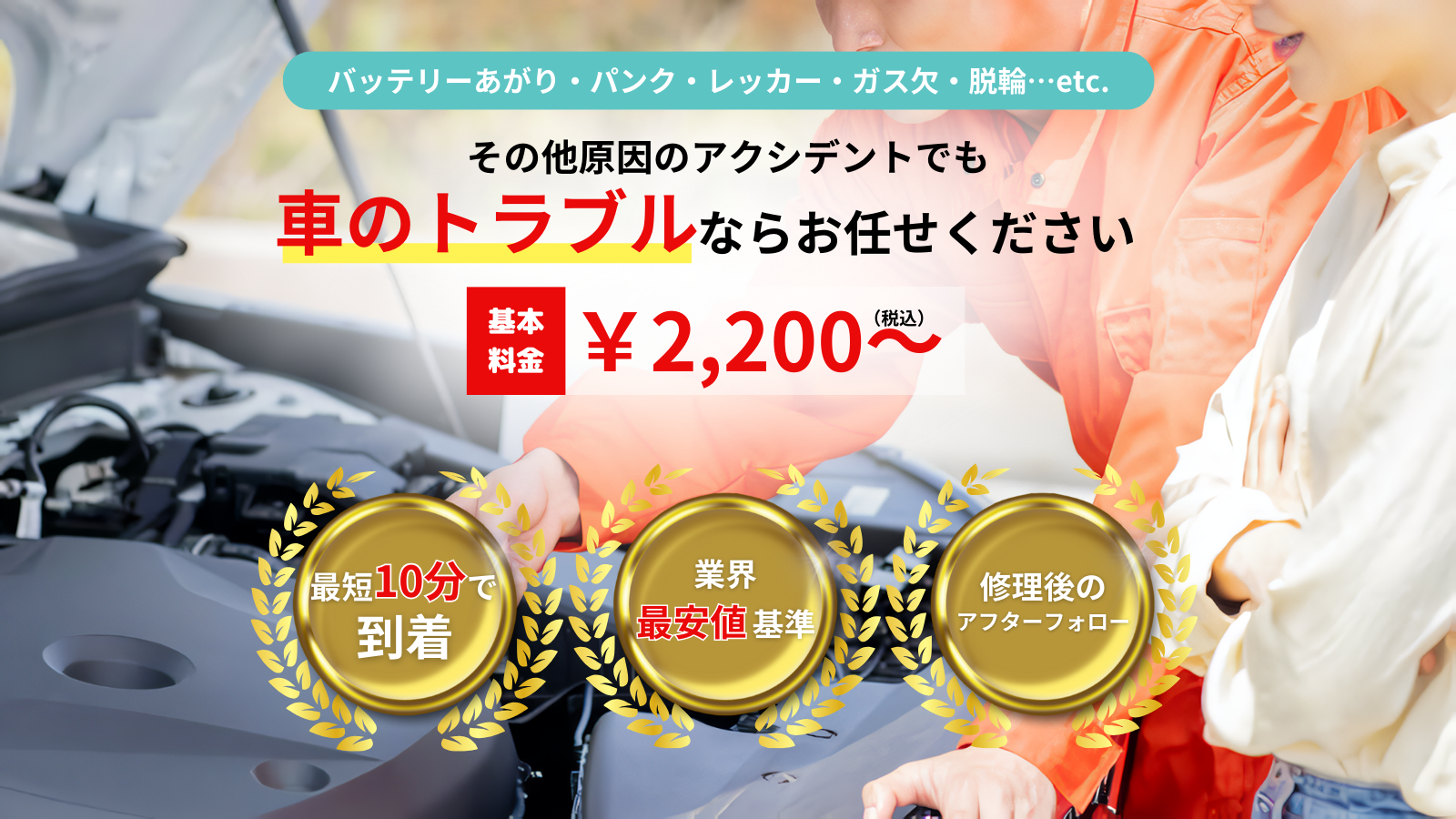 バッテリーあがりやタイヤのパンク、故障時や事故時に車が動かせない場合のレッカー移動や、ガス欠、脱輪、雪など車に関わるトラブルならすべて対応可能です。